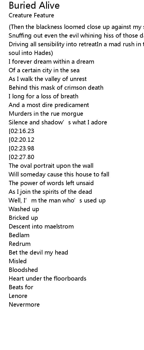 | [01:34.50][02:27.80][03:12.92][03:47.47] | With the hopes I’ll be buried alive |