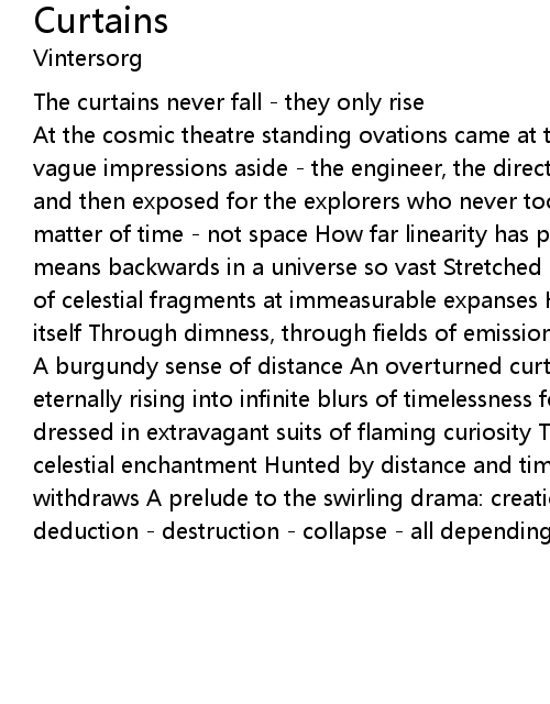 At the cosmic theatre standing ovations came at the 15 billion-mark" Blurs and vague impressions aside - the engineer, the director had the galaxies disposed, and then exposed for the explorers who never took an answer for an answer A matter of time - not space How far linearity has permitted us to see Outwards means backwards in a universe so vast Stretched in time, see it commence - a set of celestial fragments at immeasurable expanses How far a flicker can force itself Through dimness, through fields of emission The shine slowly turning red A burgundy sense of distance An overturned curtain call - the velvety draperies eternally rising into infinite blurs of timelessness for an audience correctly dressed in extravagant suits of flaming curiosity The witnesses and surveyors of celestial enchantment Hunted by distance and time The curtain reluctantly withdraws A prelude to the swirling drama: creation - formation - design or deduction - destruction - collapse - all depending on the angle |