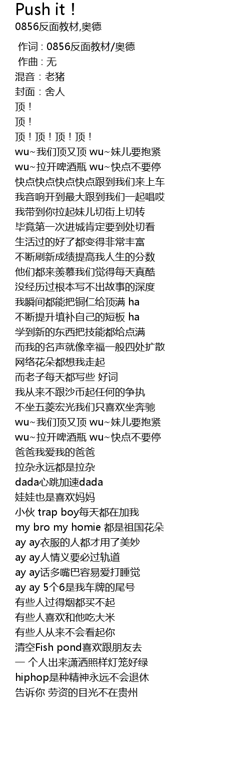 | [00:04.982] | wu~我们顶又顶 wu~妹儿要抱紧 |