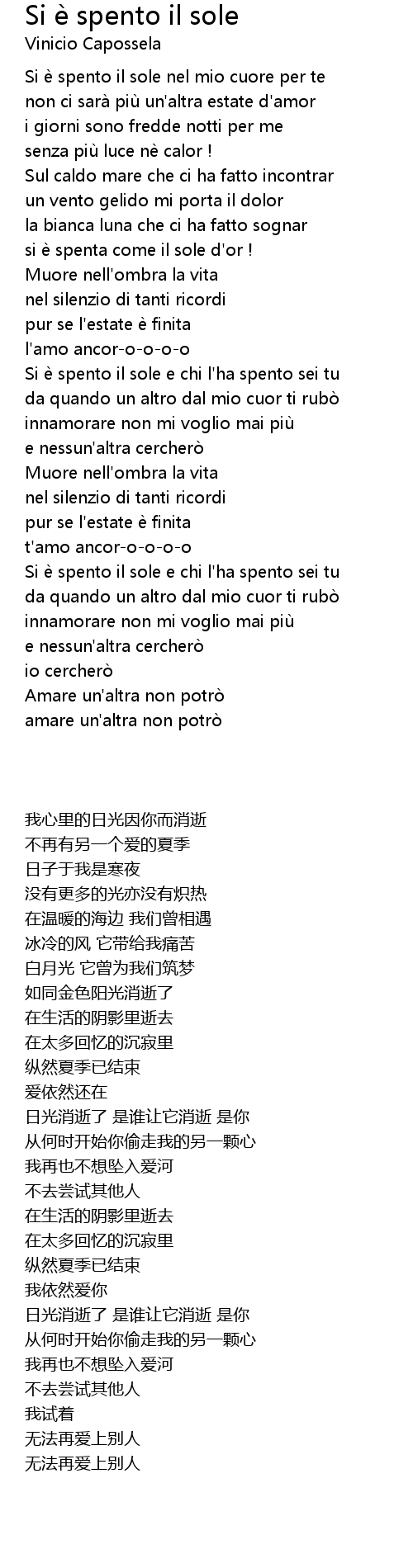 | [00:09.010] | Si e spento il sole nel mio cuore per te |