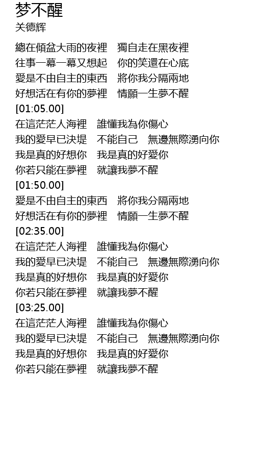 | [01:40.00] | nǐ ruò zhǐ néng zài mèng lǐ jiù ràng wǒ mèng bù xǐng |