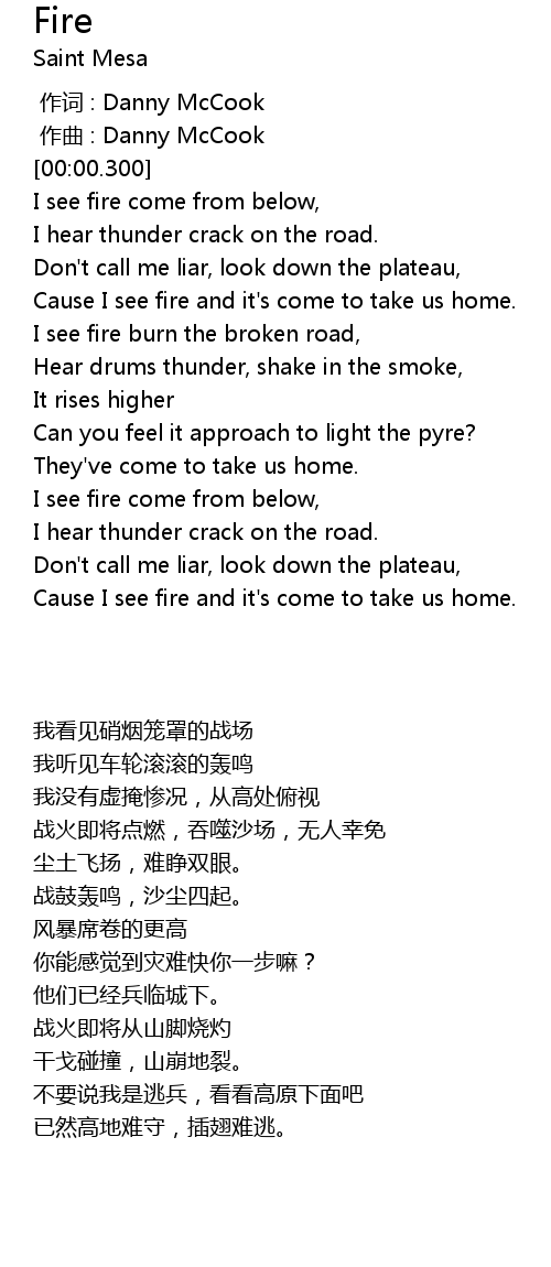 | [00:27.311] | Cause I see fire and it' s come to take us home. |