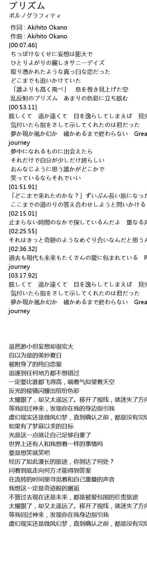 | [03:39.61] | 夢か現か風か幻か 確かめるまで終わらない Great journey |