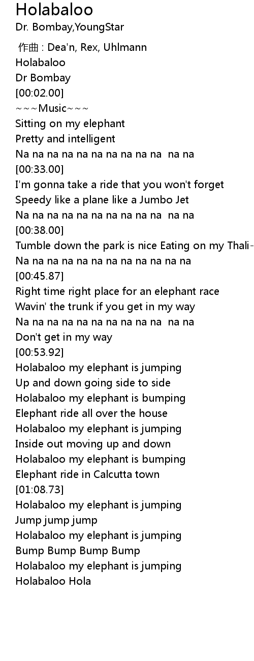 | [01:16.57] | Holabaloo my elephant is jumping |