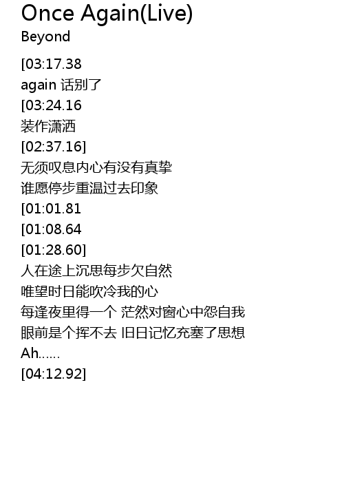 | [03:30.94][03:17.38][02:23.13][02:09.57][01:15.38][00:34.74] | Once again, once again 话别了 |