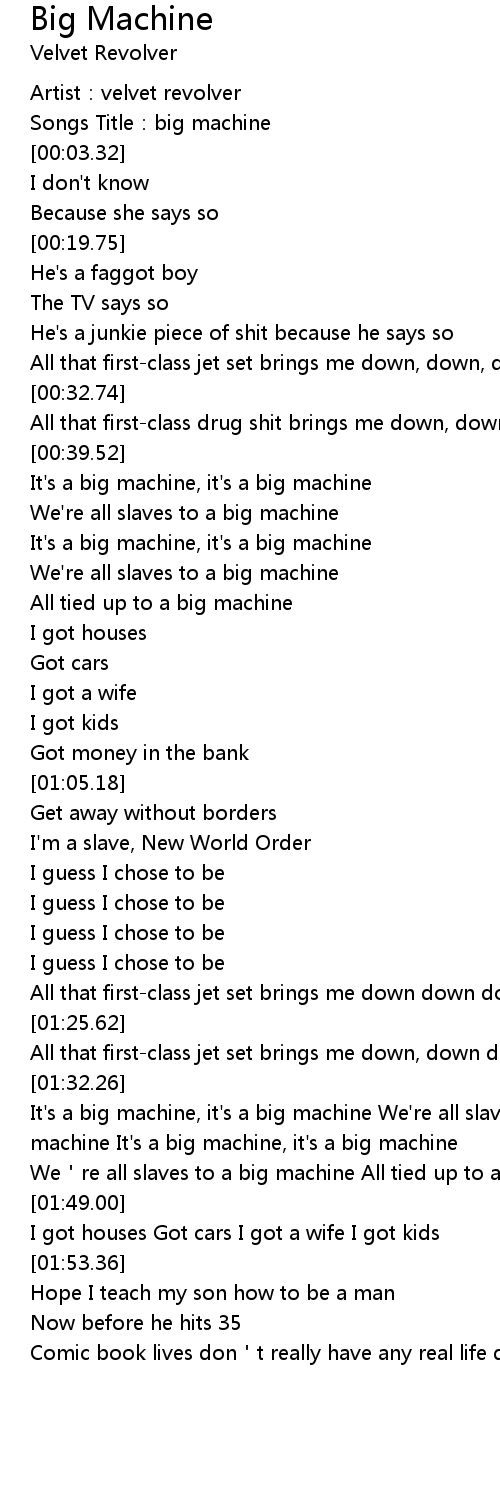 | [01:33.93] | It's a big machine, it's a big machine We're all slaves to a big machine It's a big machine, it's a big machine |