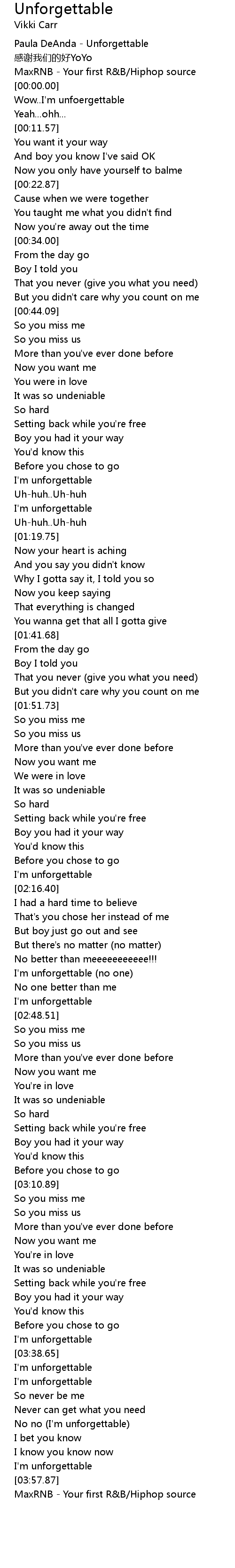 | [00:02.74] | Wow.. I' m unfoergettable |