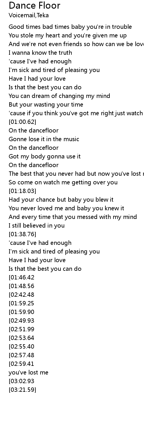 | [03:05.69][02:49.93][02:35.40][02:16.13][02:00.45] | On the dancefloor |