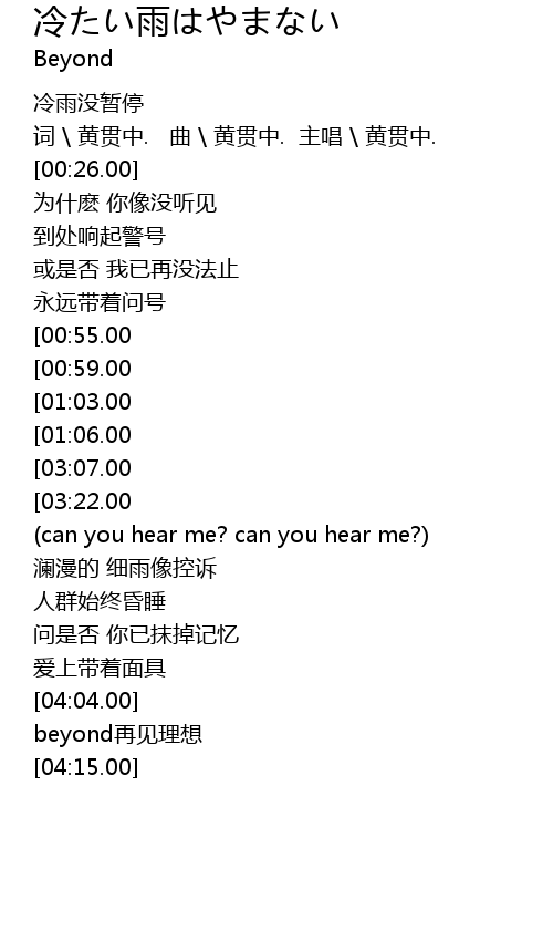 | [03:37.00][03:07.00][01:12.00] | 不想再讲 冷雨没暂停 |