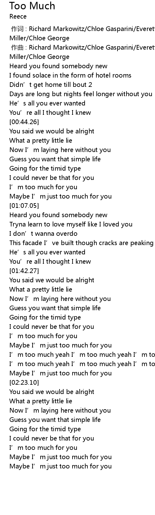 | [02:08.10] | I’m too much yeah I’m too much yeah I’m too much |