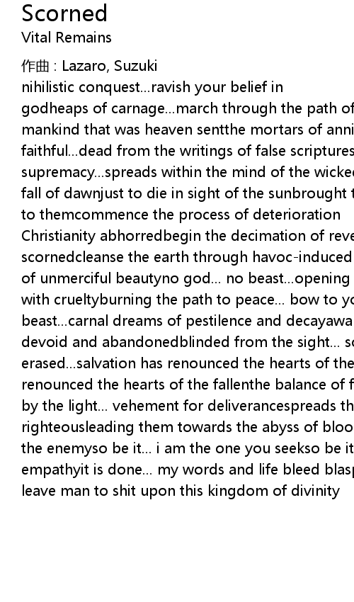 | Christianity abhorredbegin the decimation of reverenceyour life and spirit... scornedcleanse the earth through havoc-induced ferocityrejoice... this ravishing of unmerciful beautyno god... no beast...opening the gates... flood the earth with crueltyburning the path to peace... bow to your god of impurityno god... no beast...carnal dreams of pestilence and decayawaken to your world of god... now devoid and abandonedblinded from the sight... so impure and callousvision erased...salvation has renounced the hearts of the fallen...salvation has renounced the hearts of the fallenthe balance of faith has been shiftedconsumed by the light... vehement for deliverancespreads the contamination within the righteousleading them towards the abyss of blood and wickednessso be it... i am the enemyso be it... i am the one you seekso be it... i have no sympathy or empathyit is done... my words and life bleed blasphemy(repeat verses)only to leave man to shit upon this kingdom of divinity |