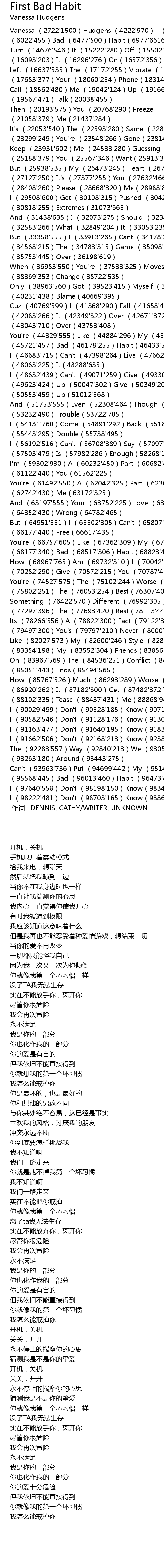 | [2722'10875] | Vanessa (2722'1500)Hudgens (4222'970)- (5192'830)First (6022'455)Bad (6477'500)Habit(6977'6616) |