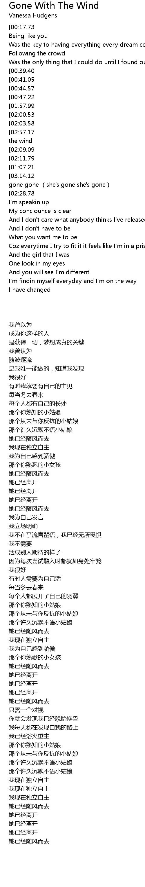 | [03:08.44][02:57.17][02:17.56][02:06.17][01:09.83][00:58.46] | Well she's gone with the wind |
