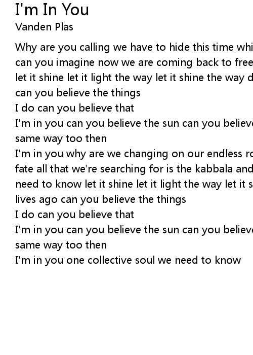 I'm in you why are we changing on our endless road how can we wear this ring of fate all that we're searching for is the kabbala and this one collective soul we need to know let it shine let it light the way let it shine a hundred million lives ago can you believe the things