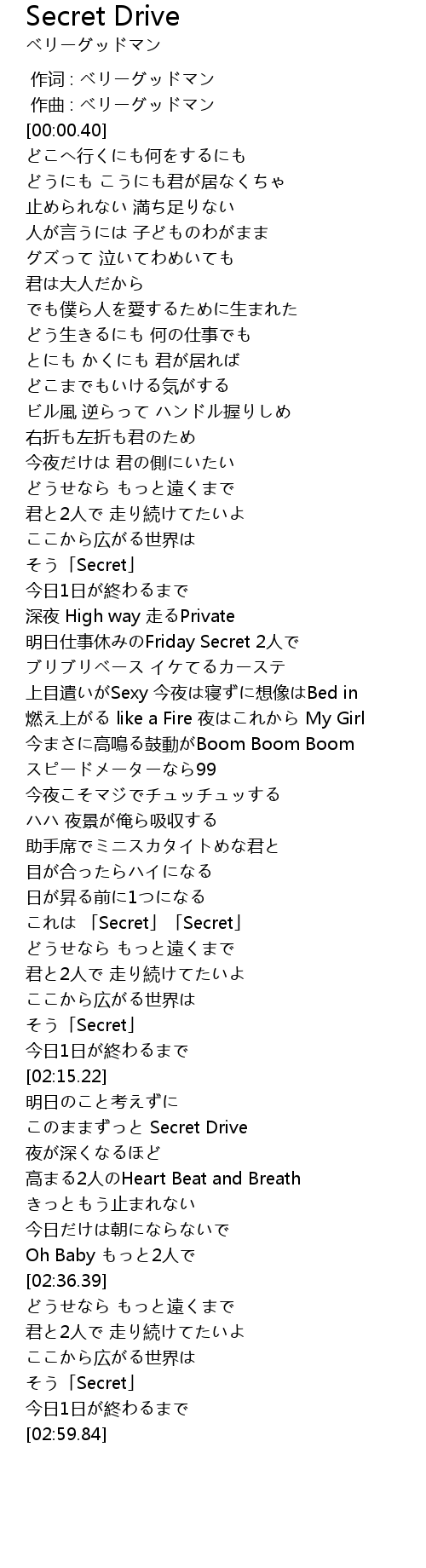 | [01:19.80] | 明日仕事休みのFriday Secret 2人で |