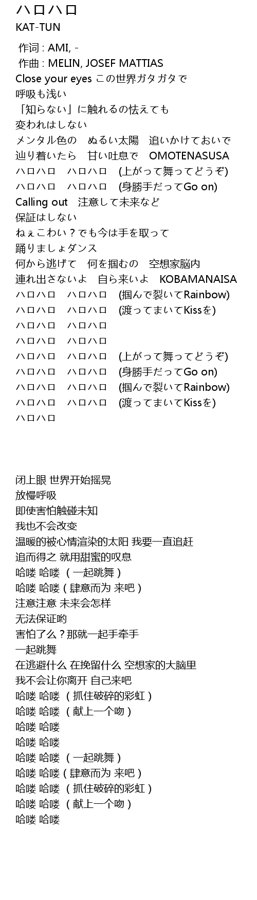 | [01:33.56] | ハロハロ ハロハロ (渡ってまいてKissを) |