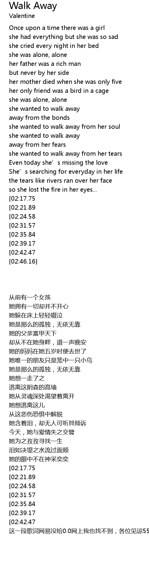 | [03:27.89][02:31.57] | she wanted to walk away |