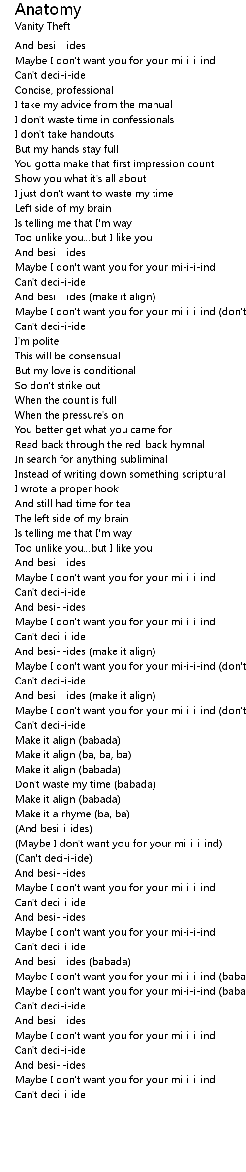 | [01:44.370] | Maybe I don't want you for your mi-i-i-ind |