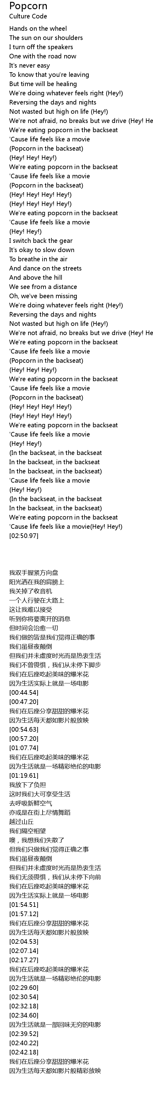 We're eating popcorn in the backseat |