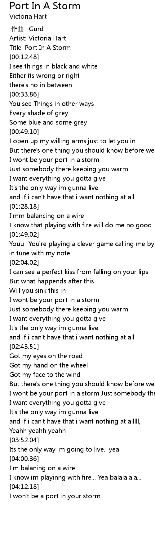 | [03:28.35] | I wont be your port in a storm Just somebody there keeping you warm |