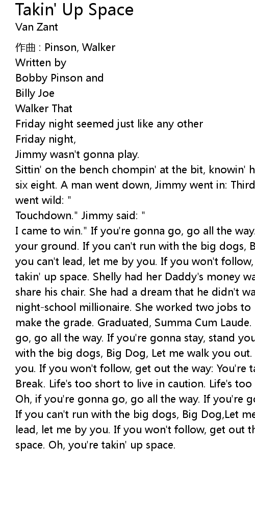 | I came to win." If you' re gonna go, go all the way. If you' re gonna stay, stand your ground. If you can' t run with the big dogs, Big dog, Let me walk you out. If you can' t lead, let me by you. If you won' t follow, get out the way: You' re takin' up space. Shelly had her Daddy' s money waitin', All she had to do was share his chair. She had a dream that he didn' t want her chasin' She was a nightschool millionaire. She worked two jobs to pay her way: Stayed up late to make the grade. Graduated, Summa Cum Laude. PhD the hard way. If you' re gonna go, go all the way. If you' re gonna stay, stand your ground. If you can' t run with the big dogs, Big Dog, Let me walk you out. If you can' t lead, let me by you. If you won' t follow, get out the way: You' re takin' up space. Instrumental Break. Life' s too short to live in caution. Life' s too long not to live it all. Oh, if you' re gonna go, go all the way. If you' re gonna stay, stand your ground. If you can' t run with the big dogs, Big Dog, Let me walk you out. If you can' t lead, let me by you. If you won' t follow, get out the way: You' re takin' up space. Oh, you' re takin' up space. |