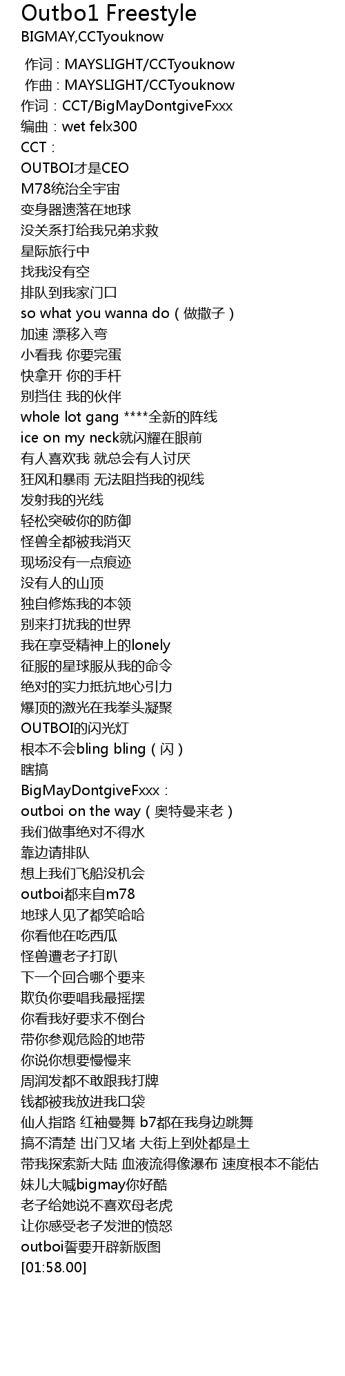 | [00:00.76] | 作词:CCT/BigMayDontgiveFxxx |