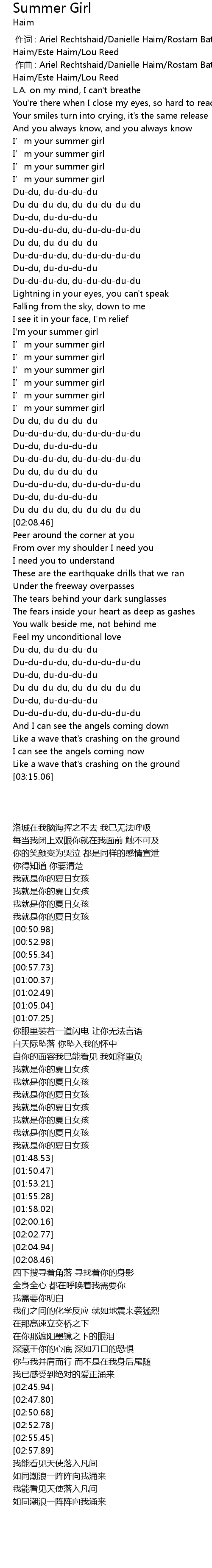 | [00:01.00] | zuò qǔ : Ariel Rechtshaid Danielle Haim Rostam Batmanglij Alana Haim Este Haim Lou Reed |