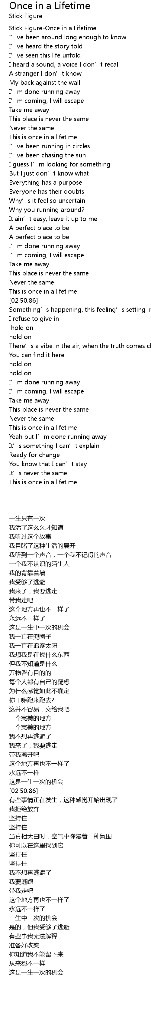| [00:00.00] | Stick Figure-Once in a Lifetime |