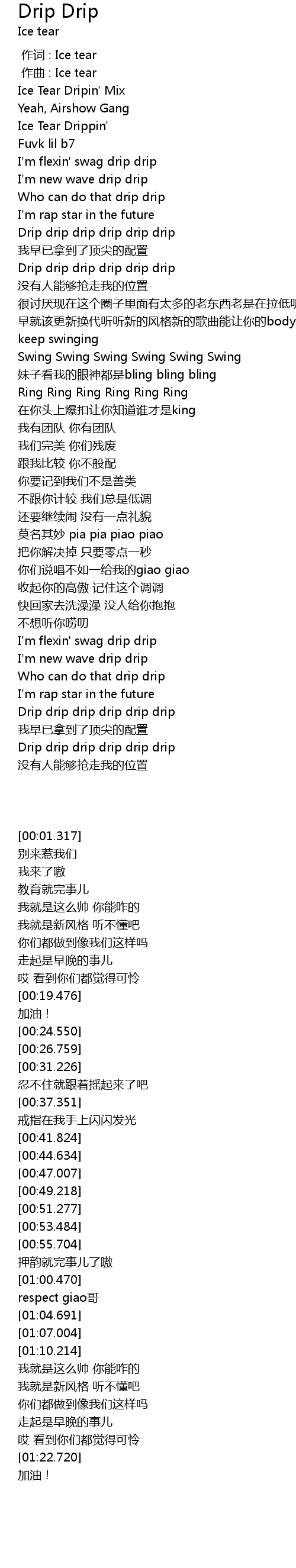 | [01:16.000] | Who can do that drip drip |