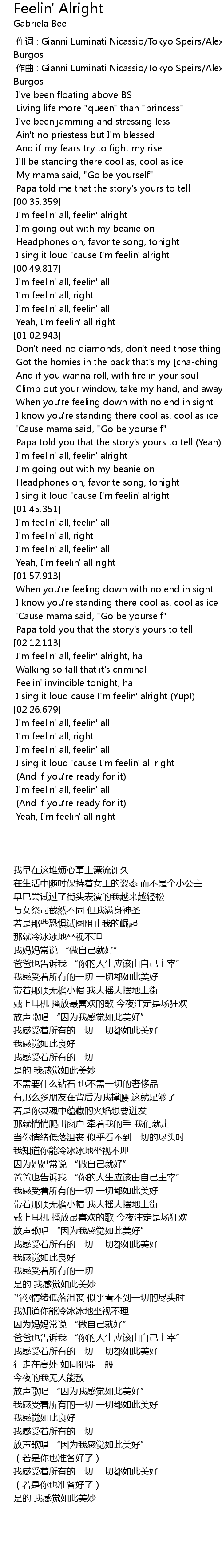 | [00:36.221] | I'm feelin' all, feelin' alright |