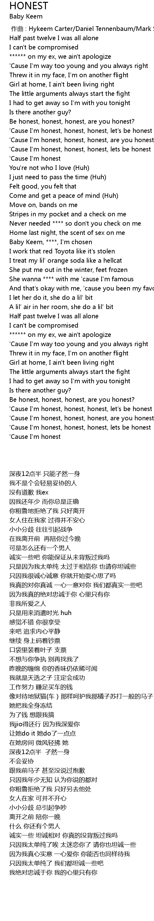 | [00:36.28] | Be honest, honest, honest, are you honest? |