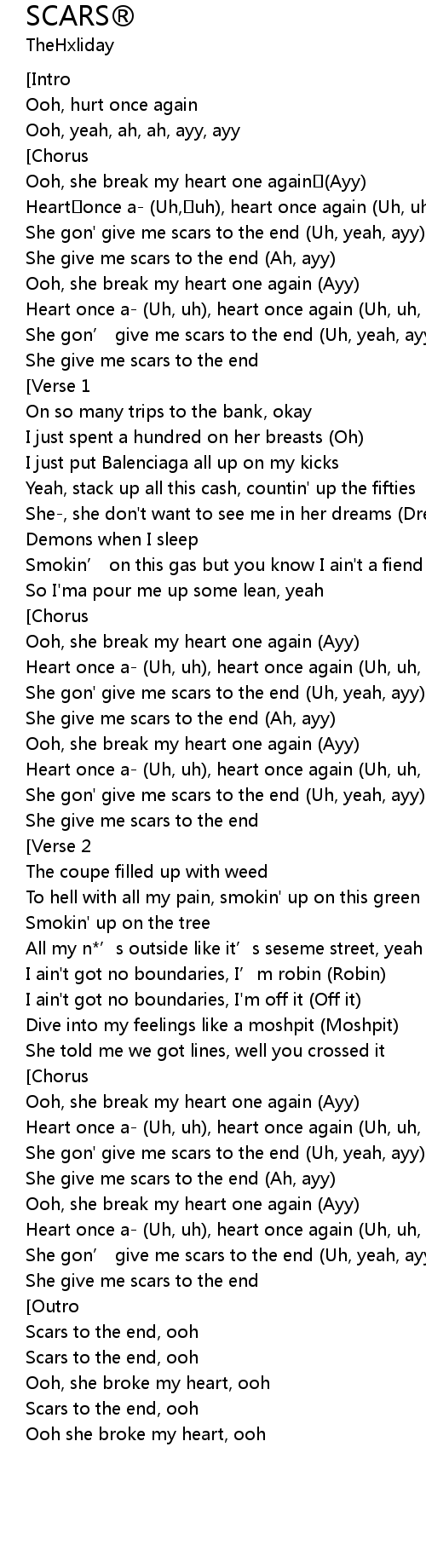 | [01:11.714] | She gon' give me scars to the end (Uh, yeah, ayy) |