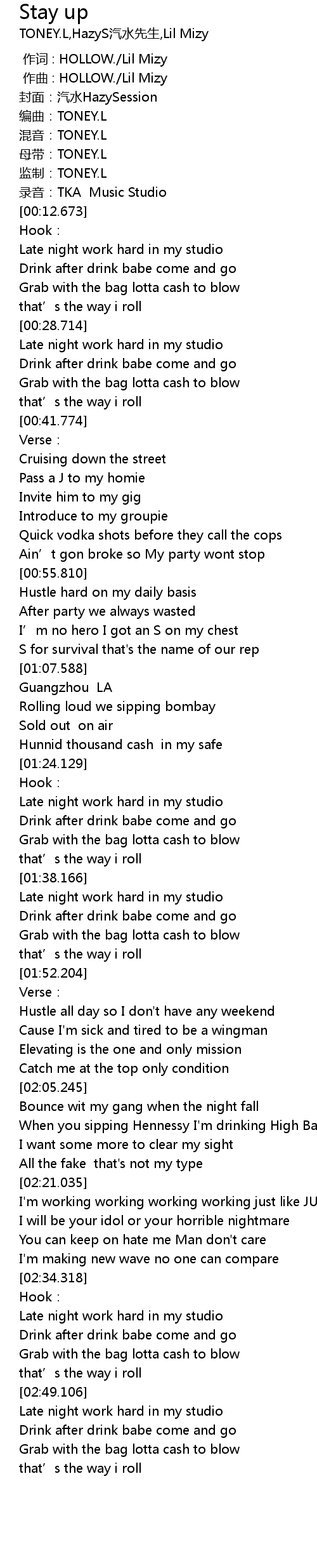 | [02:11.008] | When you sipping Hennessy I'm drinking High Ball |