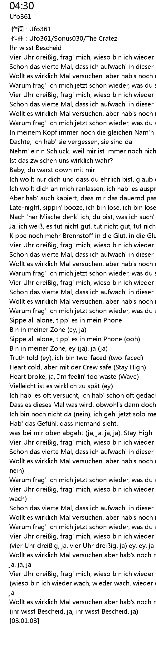 | [01:24.59] | Vier Uhr dreißig, frag' mich, wieso bin ich wieder wach? (ja) |