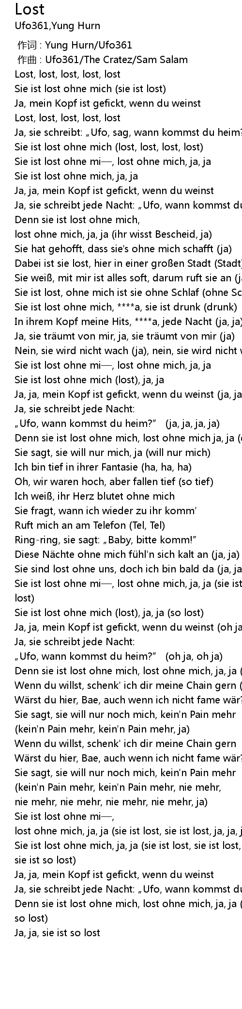 | [03:06.28] | lost ohne mich, ja, ja (sie ist lost, sie ist lost, ja, ja, ja) |