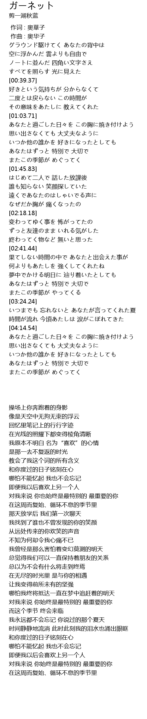 | [04:17.00] | あなたと過ごした日々を この胸に焼き付けよう |