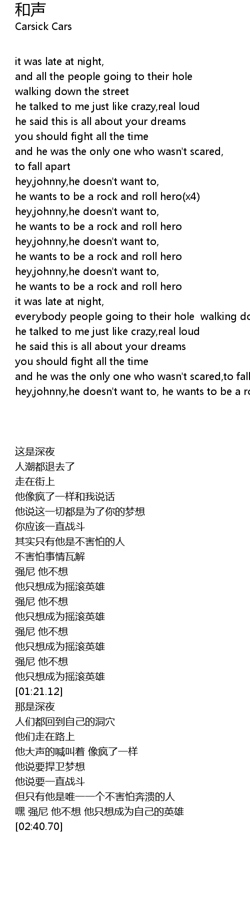 | [02:11.260] | hey,johnny,he doesn't want to, he wants to be a rock and roll hero(x4) |