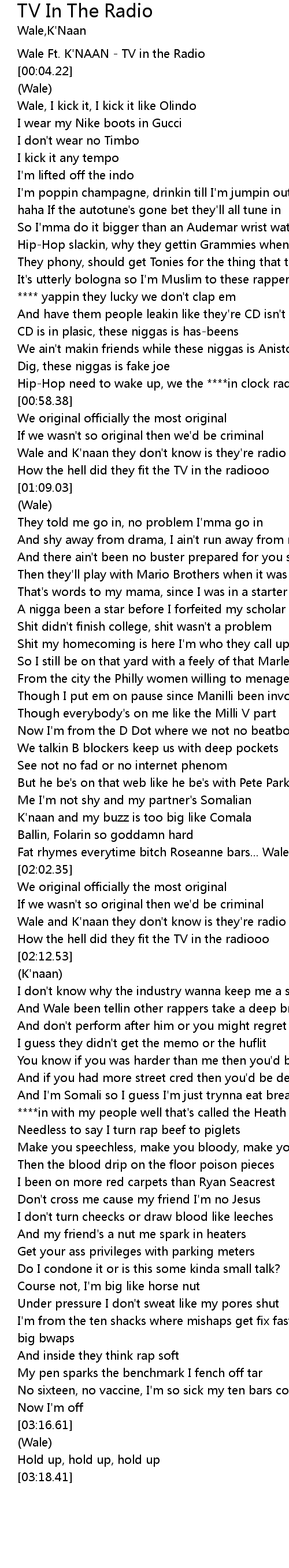 | [00:01.22] | Wale Ft. K'NAAN - TV in the Radio |