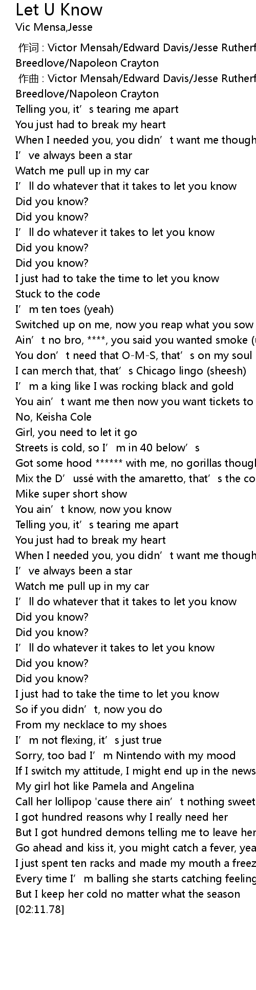 | [00:10.97] | I’ll do whatever that it takes to let you know |
