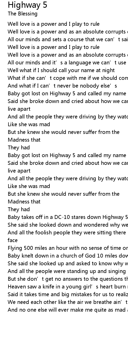 | Baby got lost on Highway 5 and called my name out loud | |
