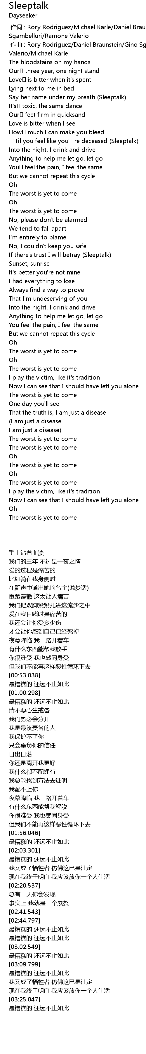 | [00:33.054] | ' Til you feel like you' re deceased Sleeptalk |