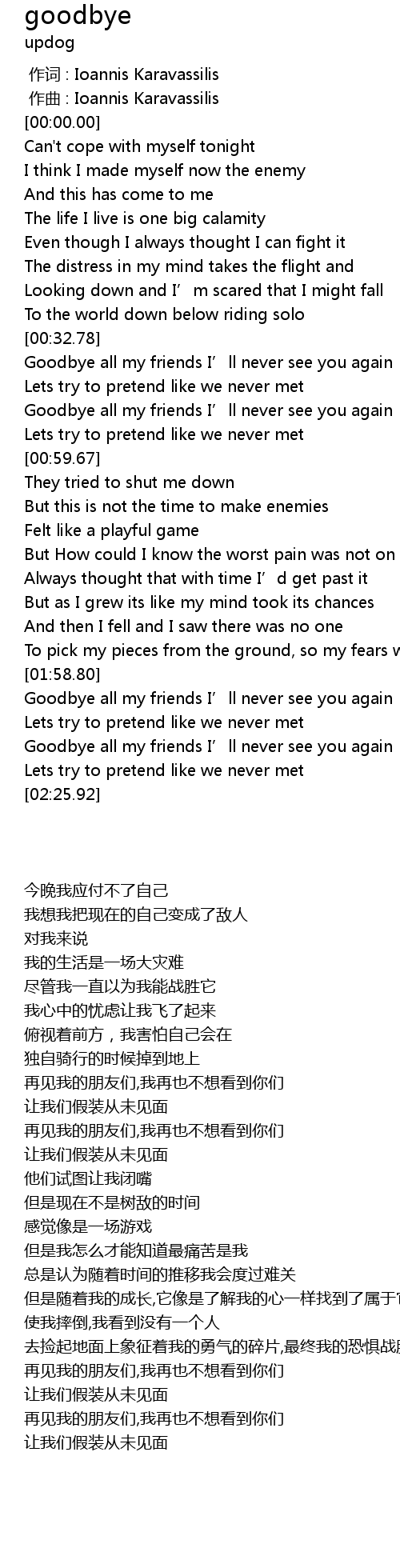 | [02:12.65] | Goodbye all my friends I' ll never see you again |