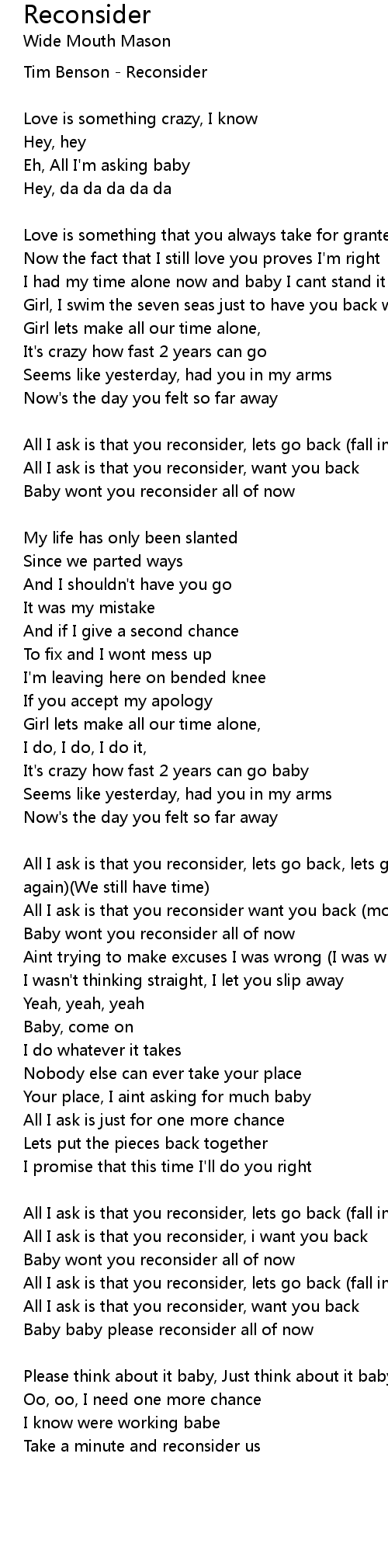 Baby wont you reconsider all of now |