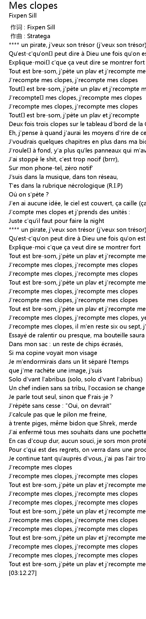| [03:01.57] | Tout est bresom, j' pè te un plav et j' recompte mes clopes |