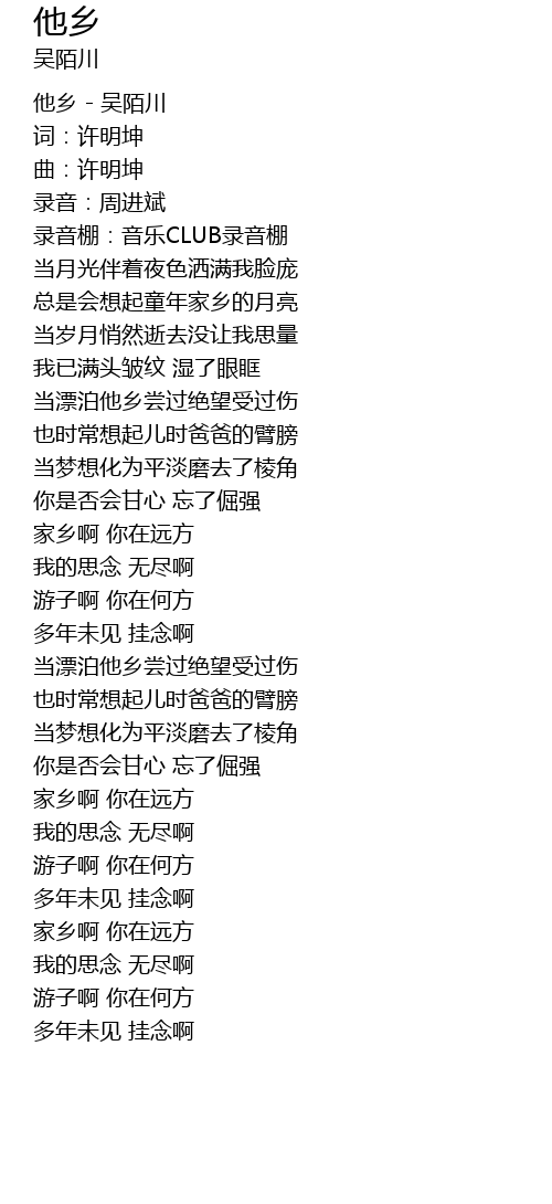 | [00:00.14] | 他乡 - 吴陌川 |