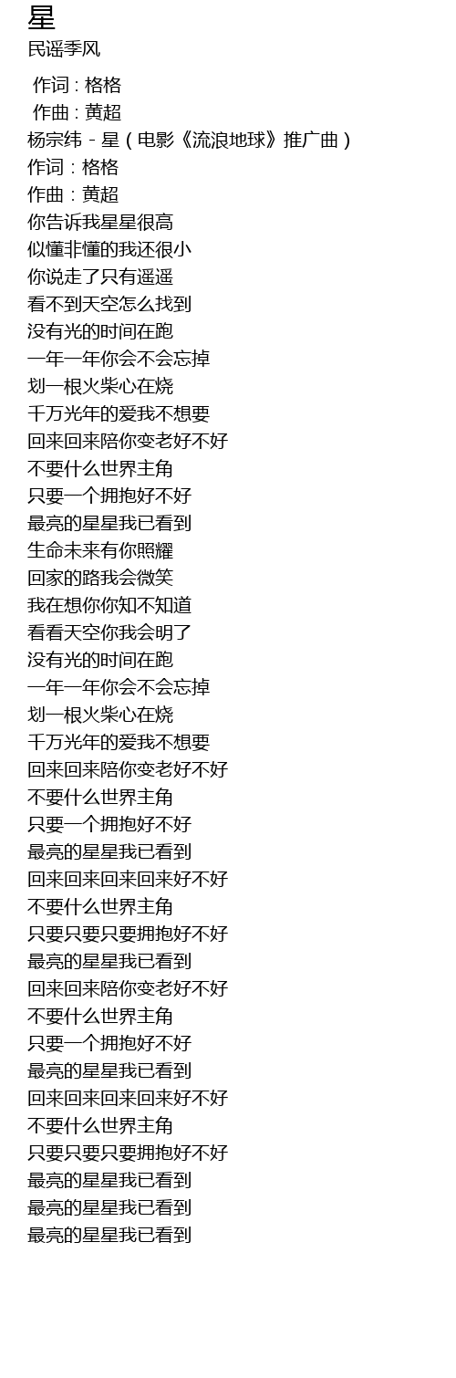| [00:02.217] | 杨宗纬 - 星(电影《流浪地球》推广曲) |