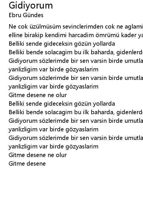 | Gidiyorum s zlerimde bir sen varsin birde umutlarim gidiyorum ellerimde bir yanlizligim var birde g zyaslarim | |