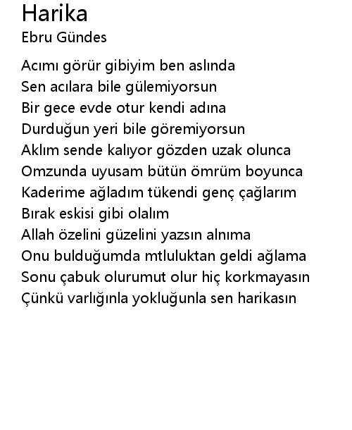 | Çünkü varlığınla yokluğunla sen harikasın |