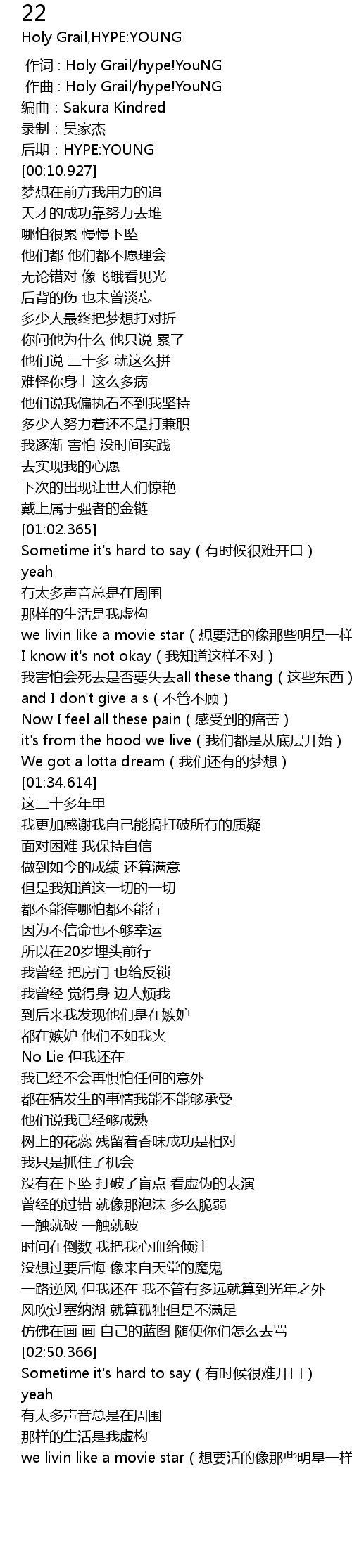 | [00:00.000] | zuo ci : Holy Grail hype! YouNG |