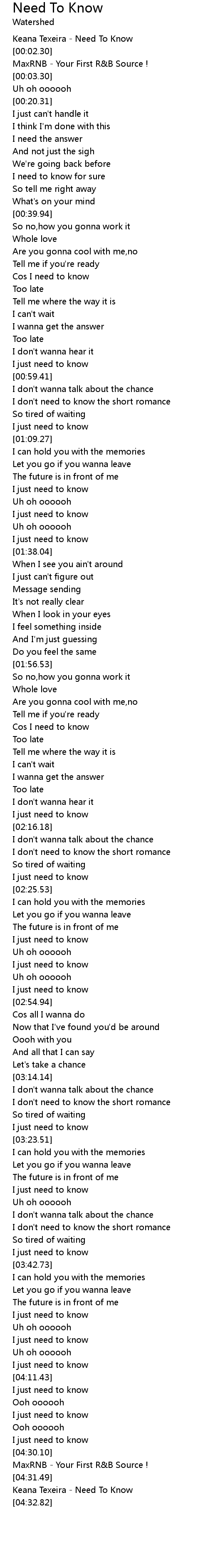 | [00:01.80] | Keana Texeira - Need To Know |